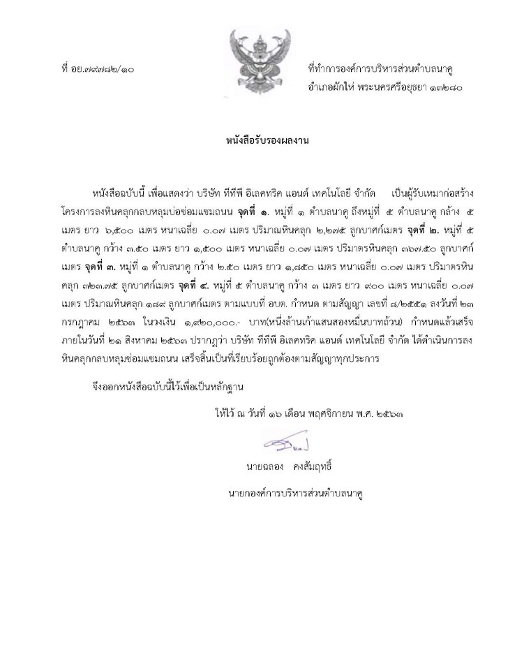 | 4 | 2563 | โครงการลงหินคลุกกลบหลุมบ่อซ่อมแซมถนน | 1,920,000 | Baht |