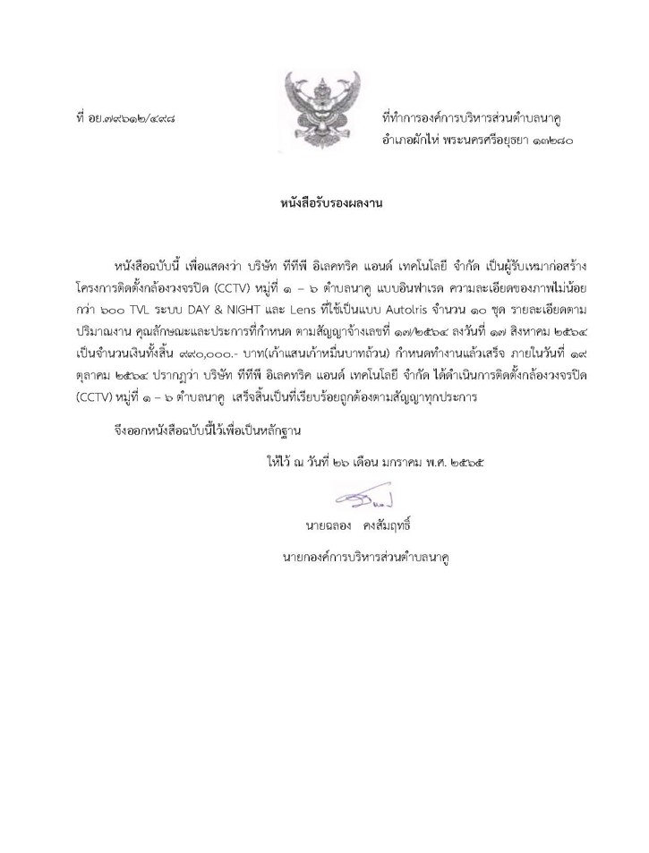 | 5 | 2565 | โครงการติดตั้งกล้องวงจรปิด (CCTV) | 990,000 | Baht |
