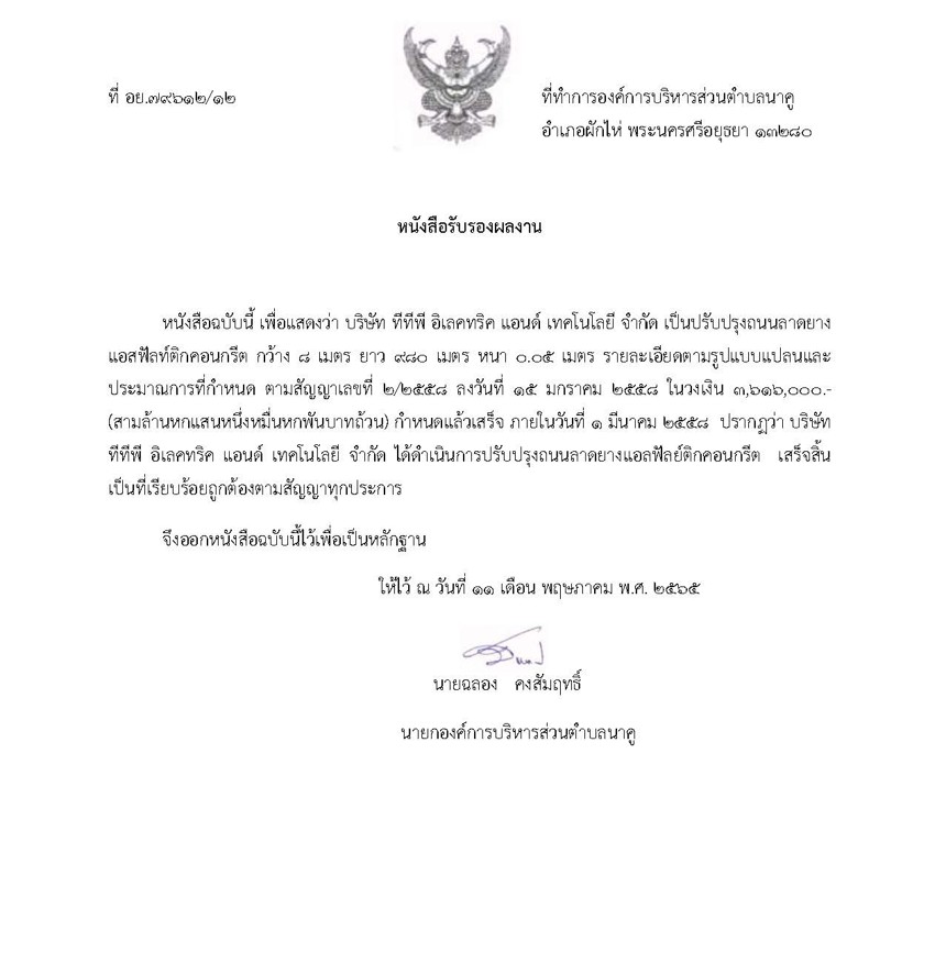 | 6 | 2565 | โครงการปรับปรุงถนนลาดยางแอสฟัลท์ติกคอนกรีต | 3,616,000 | Baht |