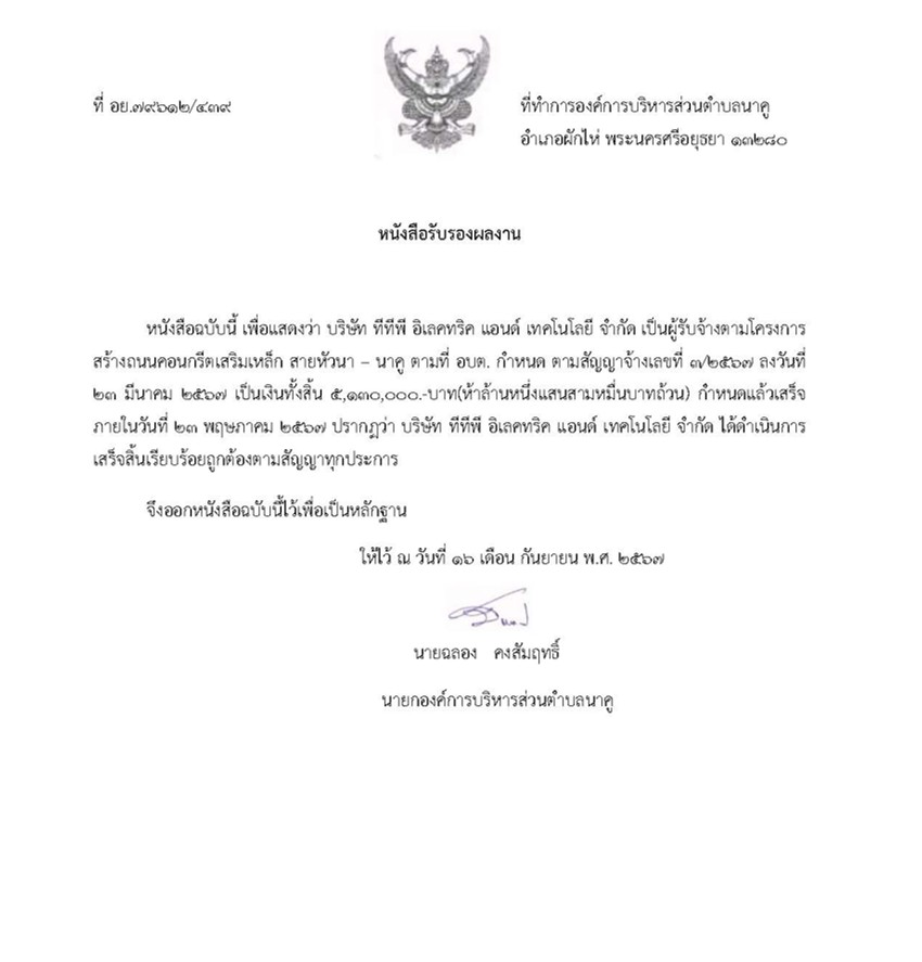 | 9 | 2567 | โครงการสร้างถนนคอนกรีตเสริมเหล็ก สายหคัวนา – นาคู | 5,130,000 | Baht |
